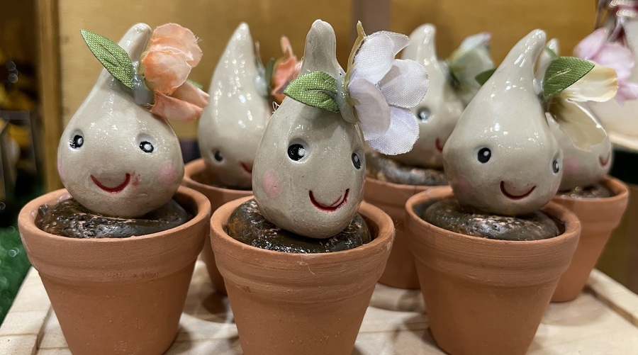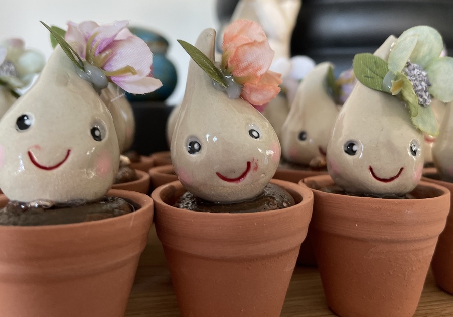 These potted Sprites are so cute, sitting In a little terracotta plant pot, they all have a wee flower attached ( colours will vary) and they all have the most adorable smiley faces.