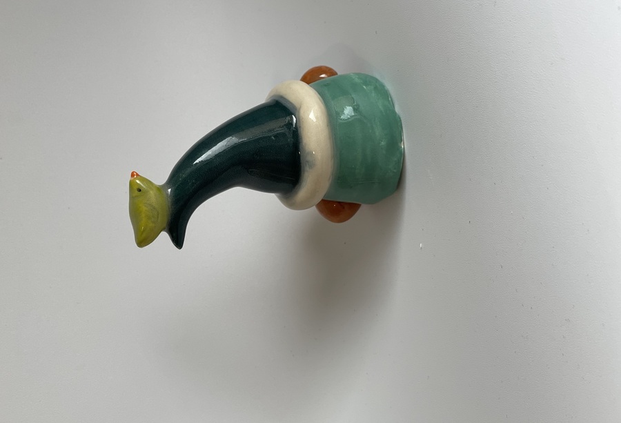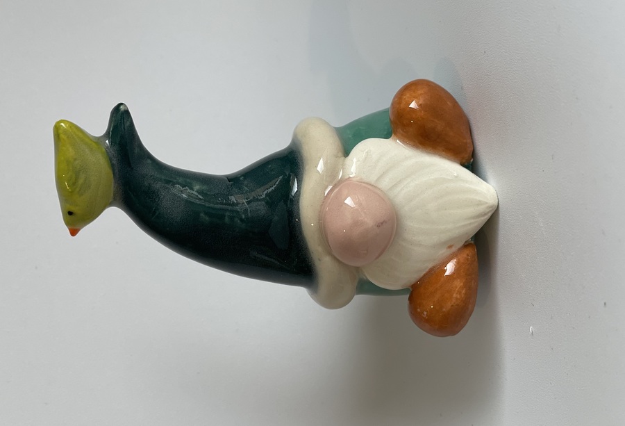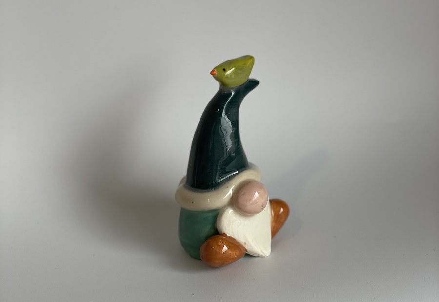 This cute little gnome has been handmade with stoneware clay, he has an Aqua blue body, brown shoes and wears a bendy green hat with a white rim. On the top of his hat sits a pretty green bird.
