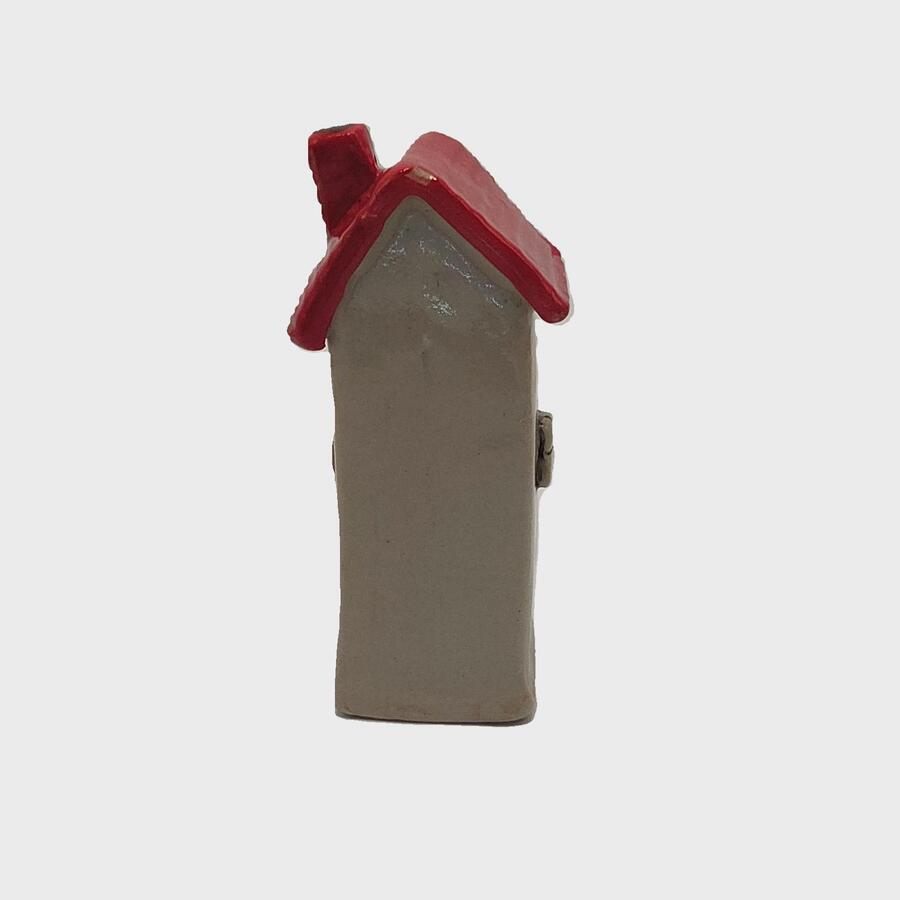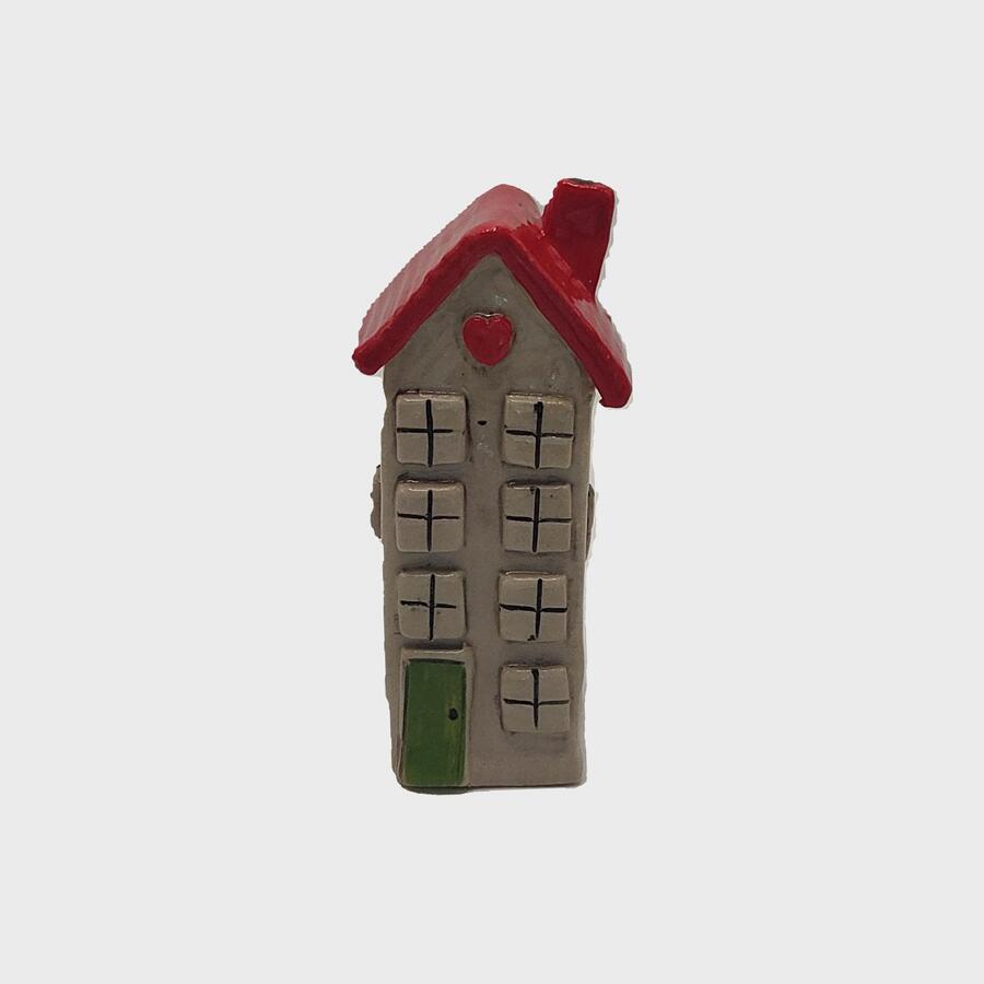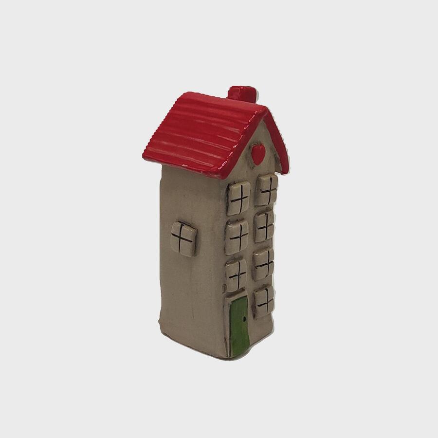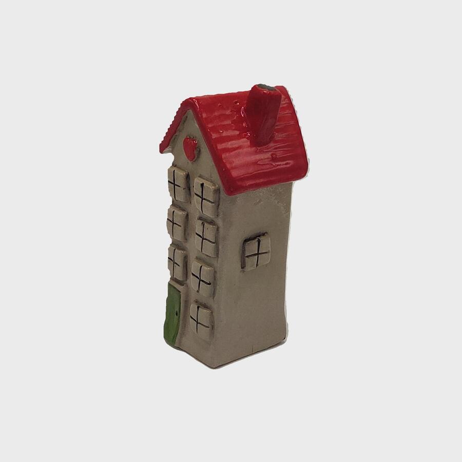 This house features 9 painted windows, Meaow Green door and red heart detail on the front. The walls are the natural colour of the clay and the textured roof and chimney are painted in a vibrant Chilli Red.