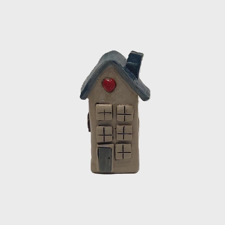 This house features 7 painted windows, Flint Grey door and red heart detail on the front. The walls are the natural colour of the clay and the textured roof and chimney are painted in a beautiful Slate Blue.