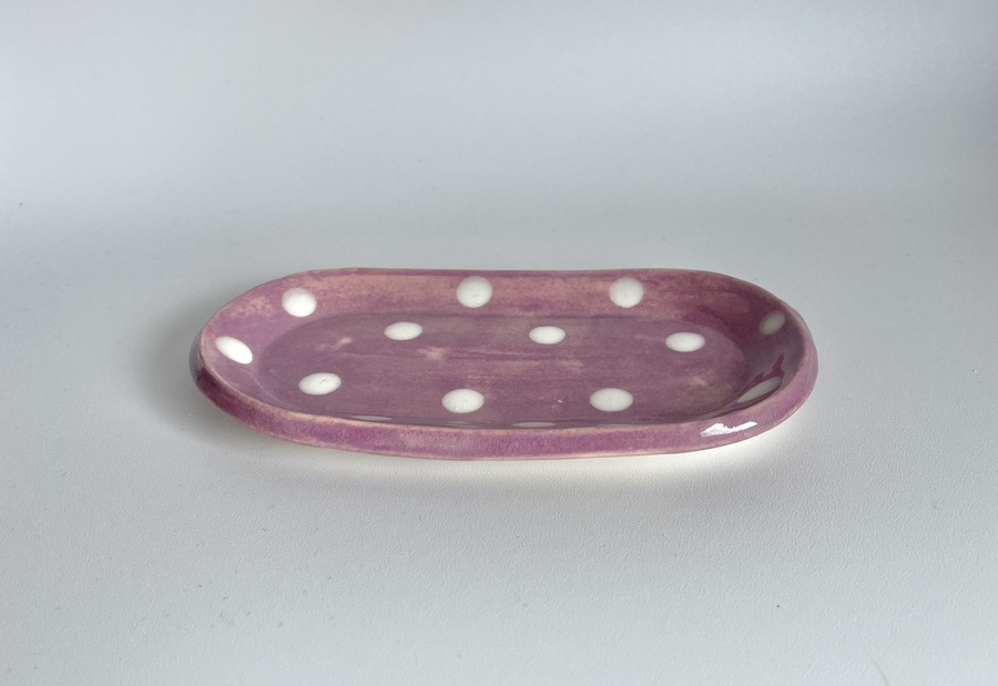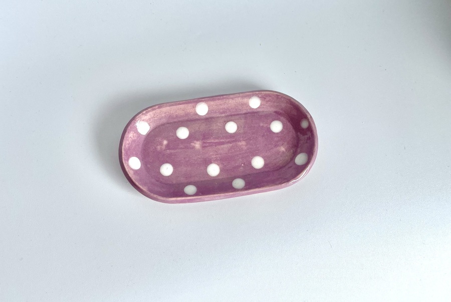 This beautiful oval jewellery dish is the perfect place to keep all your earrings and other jewellery together. Painted in a pretty lilac with white dots.