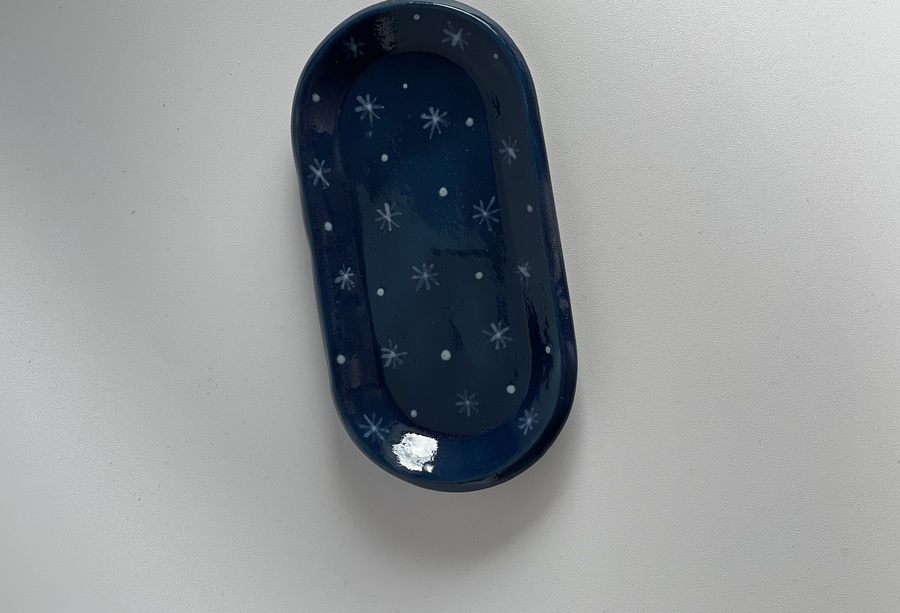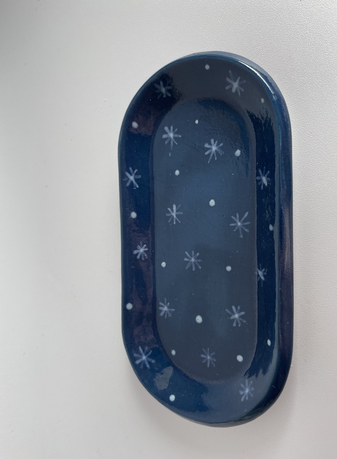This beautiful oval jewellery dish is the perfect place to keep all your earrings and other jewellery together. Painted in an elegant navy blue and dotted with little white stars.
