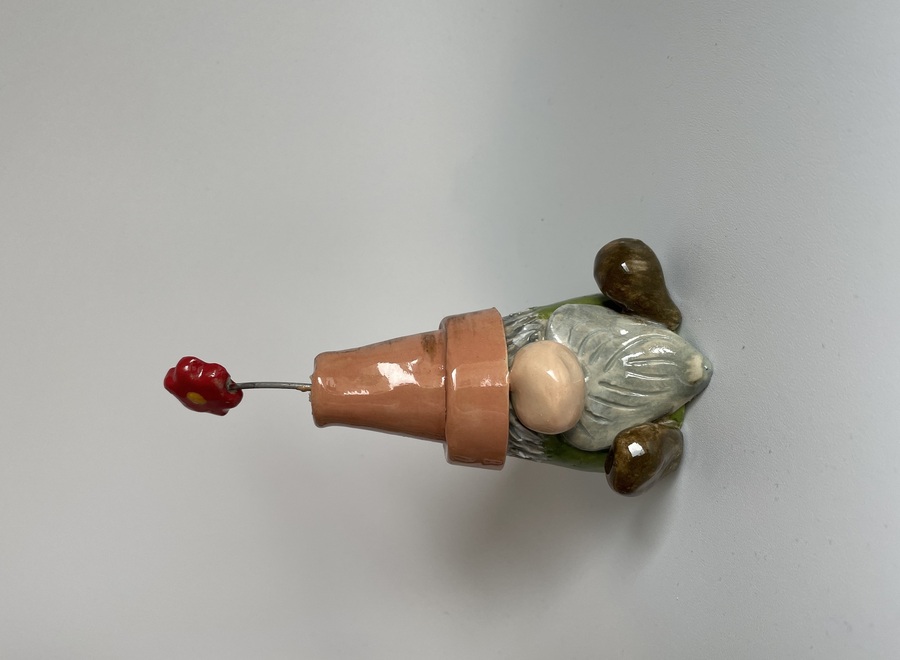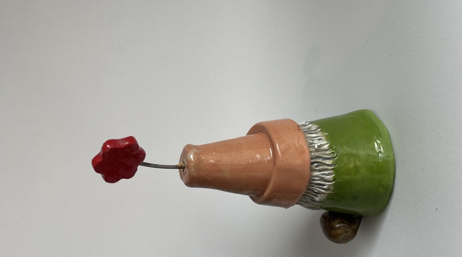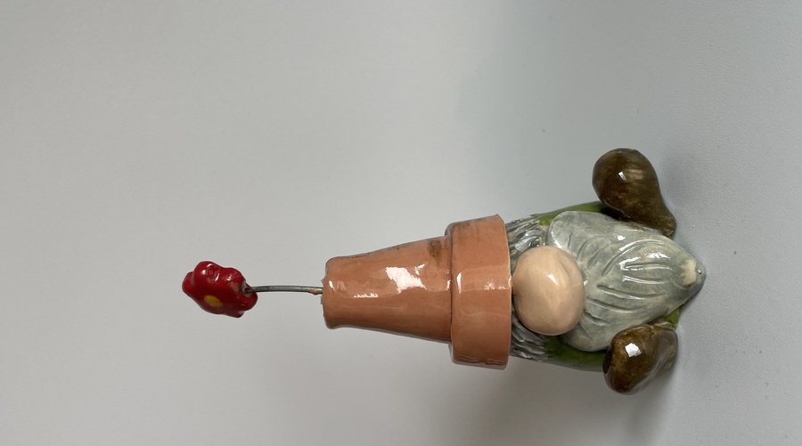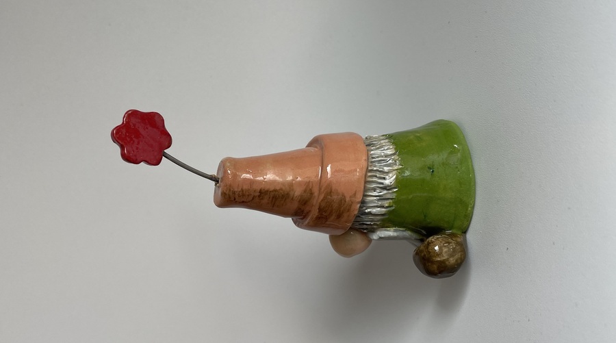 This cute little gnome has been handmade with stoneware clay, he has a green body, brown shoes and upon his head sits an upside down terracotta pot with a flower sticking out the top.