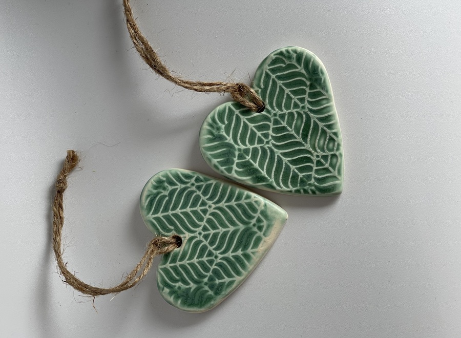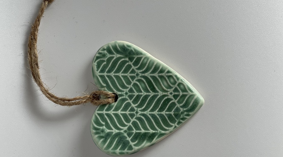 Little Heart Decoration imprinted with leaf design on natural twine.