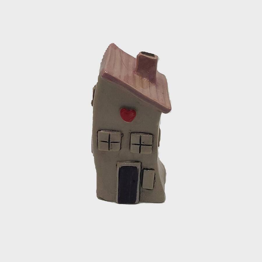 This house features 2 painted windows, 4 rectangle windows, Royal Purple door and red heart detail on the front. The walls are the natural colour of the clay and the textured roof and chimney are painted in a subtle Blush Pink..